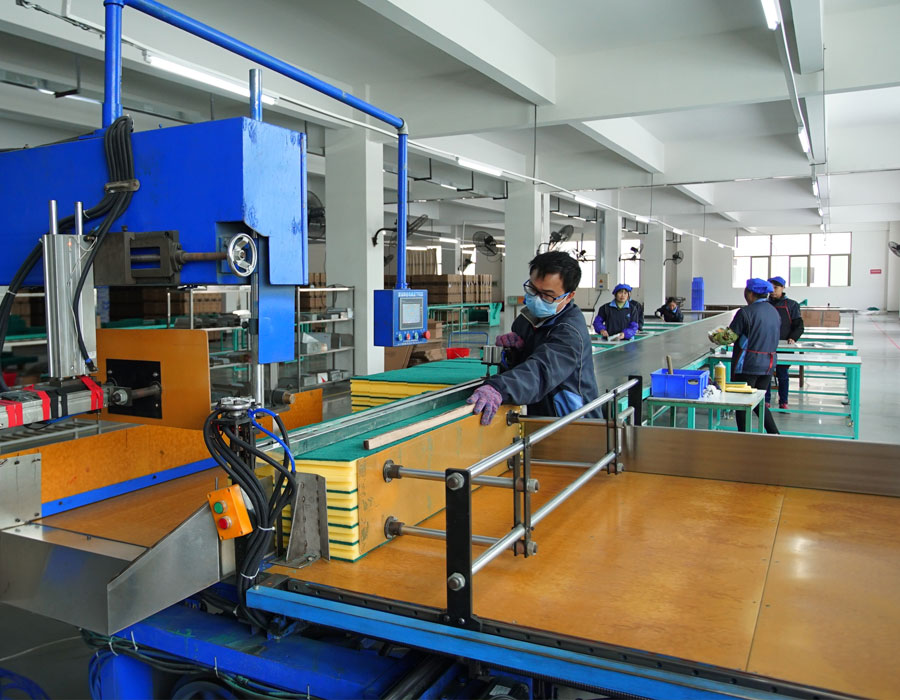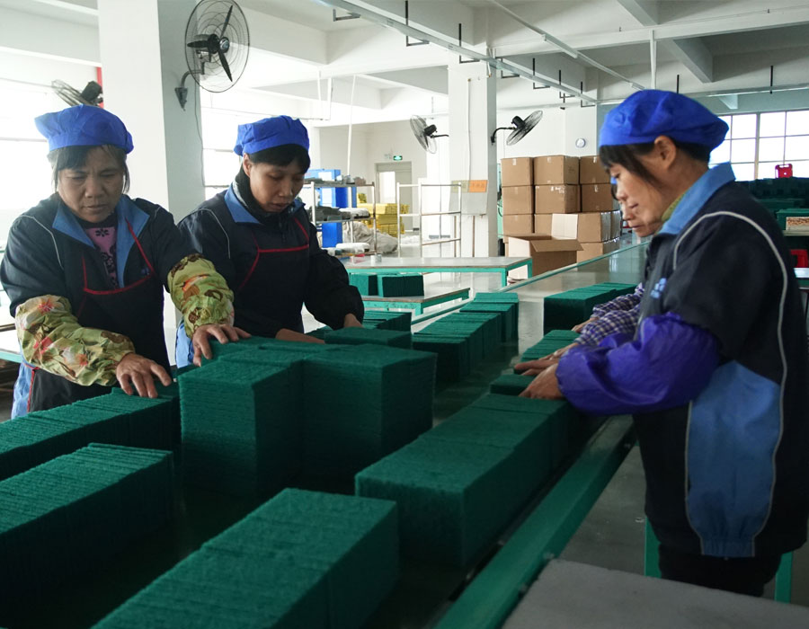 In the foaming and adhesive workshop, there are 2 cutting machines, 1 gluing machine, 1 adhesive machine and 1 foaming machine, daily output 2800 m2 sponge scrubber and 100 m3 foam.