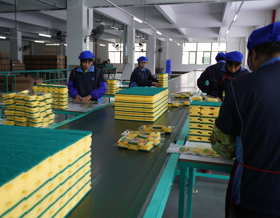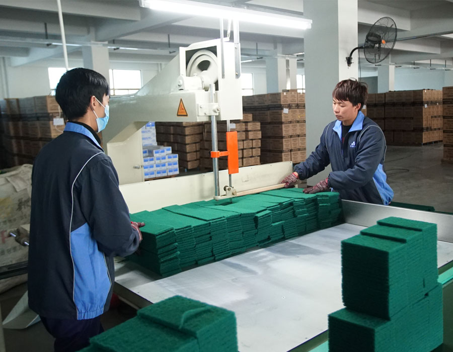 There are 2 Cutting and punching workshops include 3 cutting machines and 5 punching machines. The daily output of cutting workshop is 5000 m2 sponge scrubber, and daily output of punching workshop is 3000 m2.
